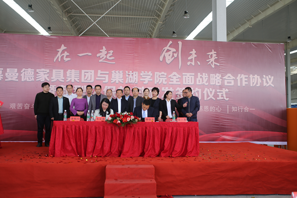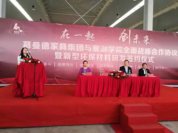 4月29日下午,beat365中国官方网站与慕曼德家具集团全面战略合作协议暨新型环保材料研发签约仪式在安徽慕曼德环保家具产业园隆重举行。校党委委员、副校长朱定秀,含山县人民政府副县长、含山经济开发区管理委员会主任裴小勇,慕曼德家具集团总经理赖俊良出席仪式并致辞。科技处处长万新军、化学与材料工程学院院长李明玲、艺术学院副院长褚春元等参加签约仪式。