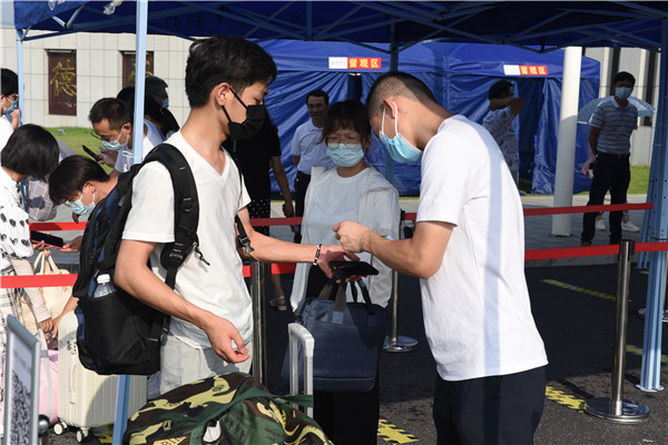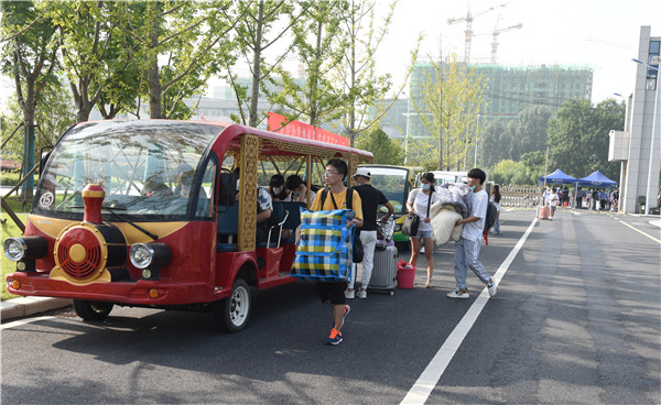 报到现场,返校学生通过测量体温、查验返校许可码、48小时内核酸检测阴性证明、安康码和行程卡绿码等报到流程进入校园,带着随身行李物品在工作人员引导帮助下坐上校园摆渡车,返回温馨的寝室。