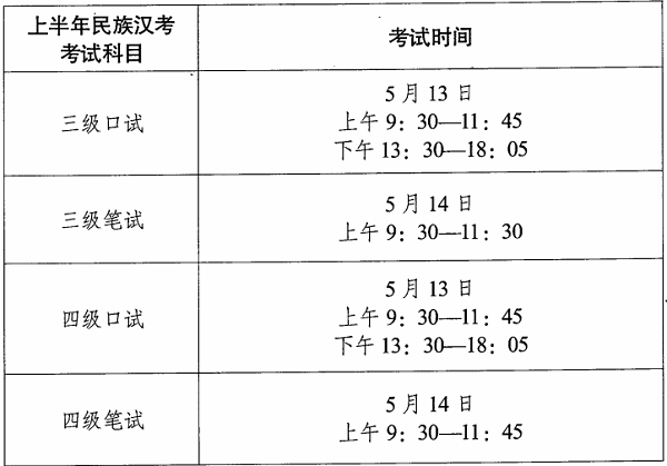 我省上半年民族汉考考试日期为2023年5月13日至14日;开考科目为三级、四级笔试和口试。具体时间安排见下表。