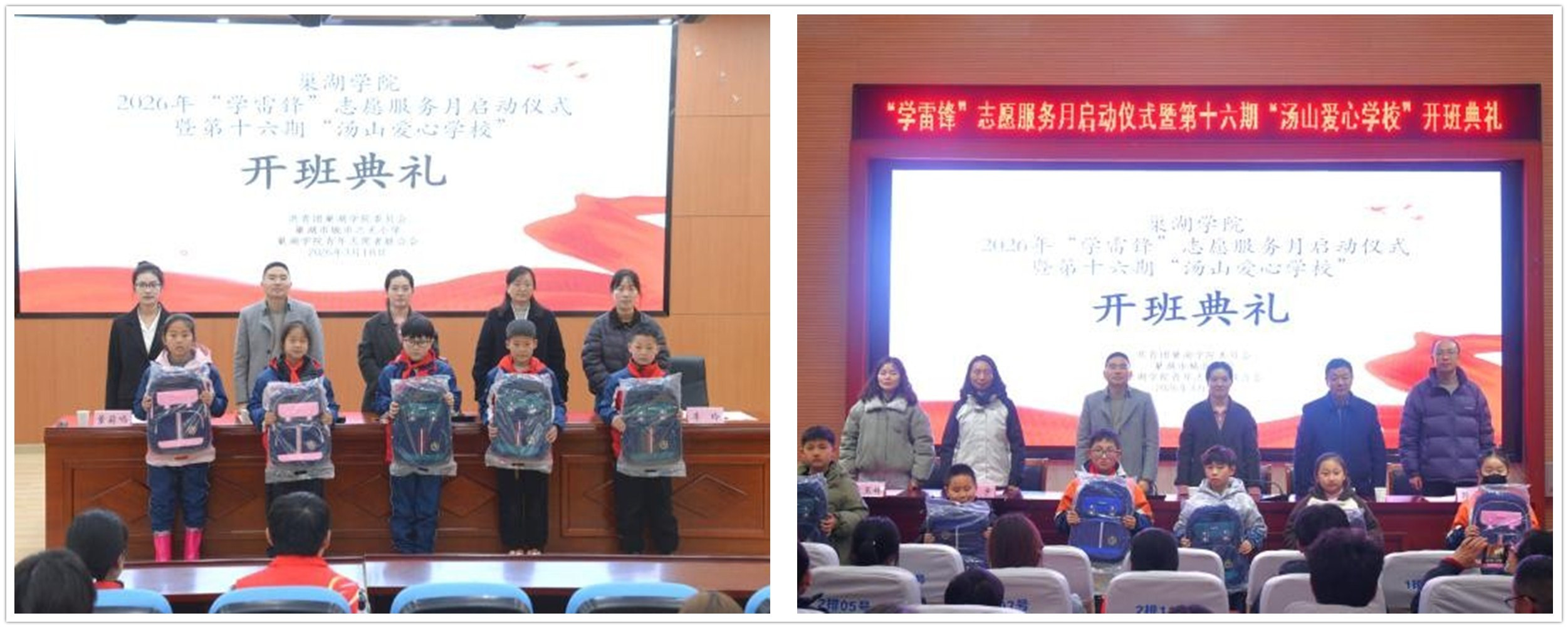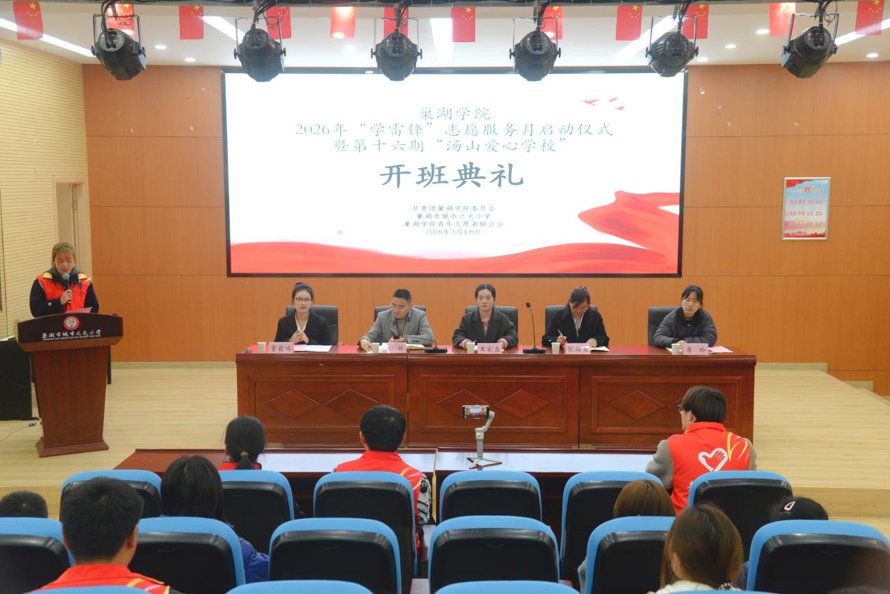 薪火相传,爱心启航。3月18日,beat365中国官方网站2026年“学雷锋”志愿服务月启动仪式暨第十六期“汤山爱心学校”开班典礼,分别在巢湖市城北小学、城市之光小学举行。团巢湖市委副书记王家垚,巢湖市城北小学校长张安舒、城市之光小学校长张炳兰,校团委副书记王林,校团委秘书、校青年志愿者联合会指导教师李玲,青年志愿者联合会成员代表、第十六期“汤山爱心学校”全体志愿者、受助学生及学生家长参加。