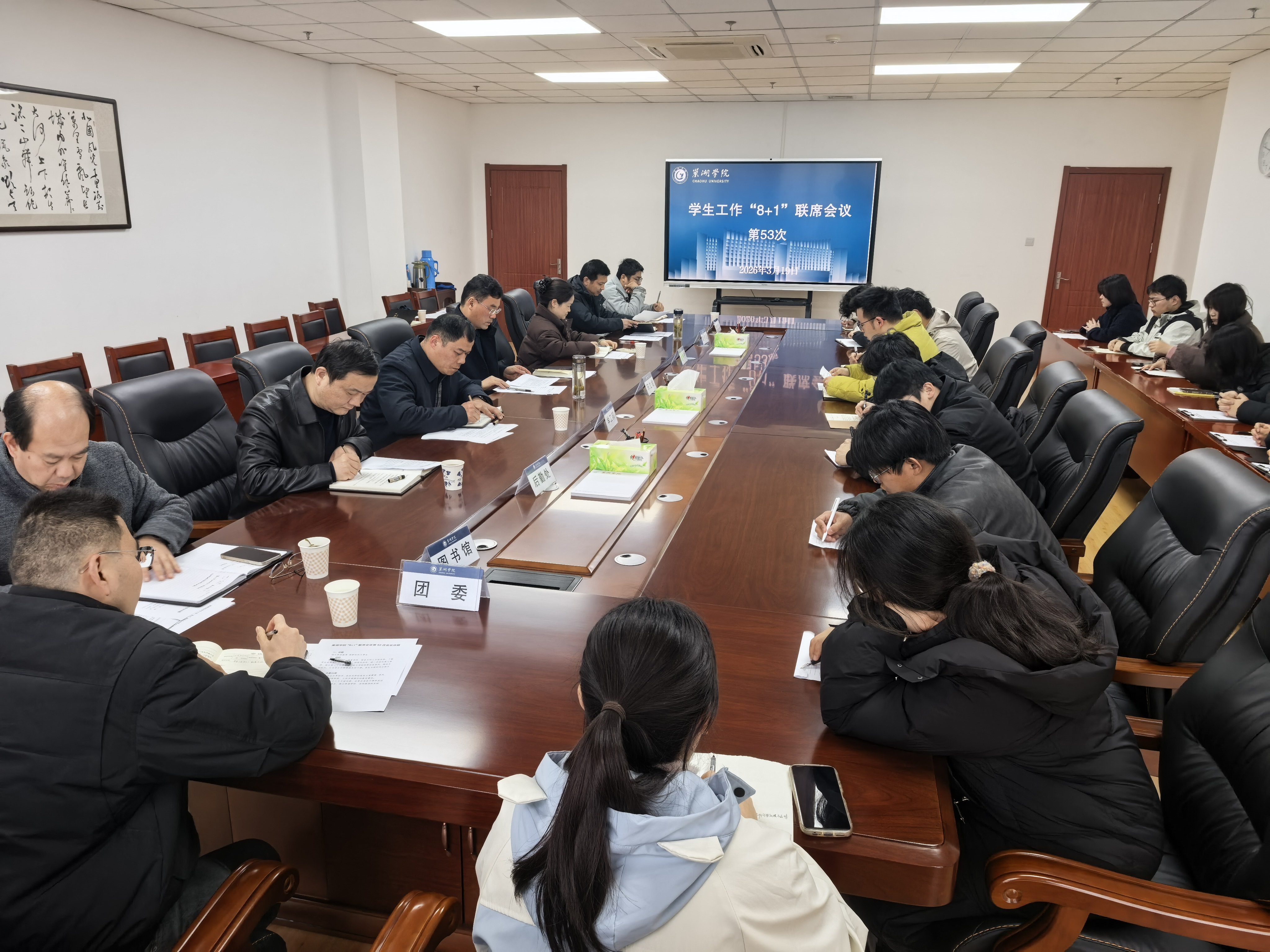 3月19日下午,beat365中国官方网站第53次学生工作“8+1”联席会议在第二会议室召开。校党委副书记宋立敏主持会议并讲话,宣传部、学工部、教务处、后勤处、信息化处、图书馆、团委等部门负责人及学生代表共同参会。