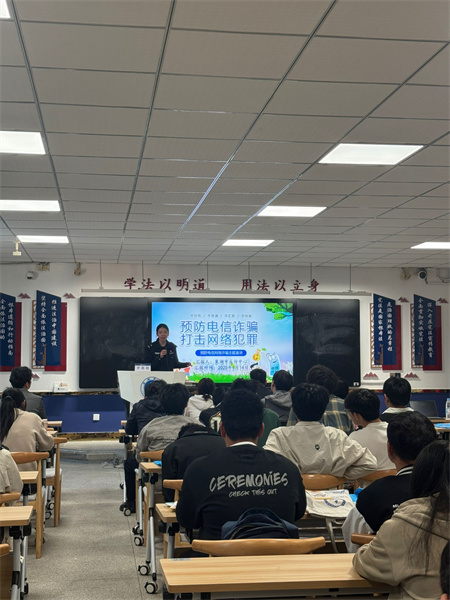 随后,巢湖市公安局刑警大队民警罗萌萌围绕《中华人民共和国反电信网络诈骗法》展开讲解。通过详实的数据和生动的案例,罗警官系统介绍了电信网络诈骗的常见手段、受害群体特征及防范措施。她特别针对大学生群体易受骗的“刷单诈骗”、“游戏装备诈骗”、“冒充客服诈骗”等诈骗形式进行了深入分析,并传授了实用的防骗技巧。罗警官提醒同学们要增强法律意识,保护个人信息,做到“不轻信、不转账、不透露”。