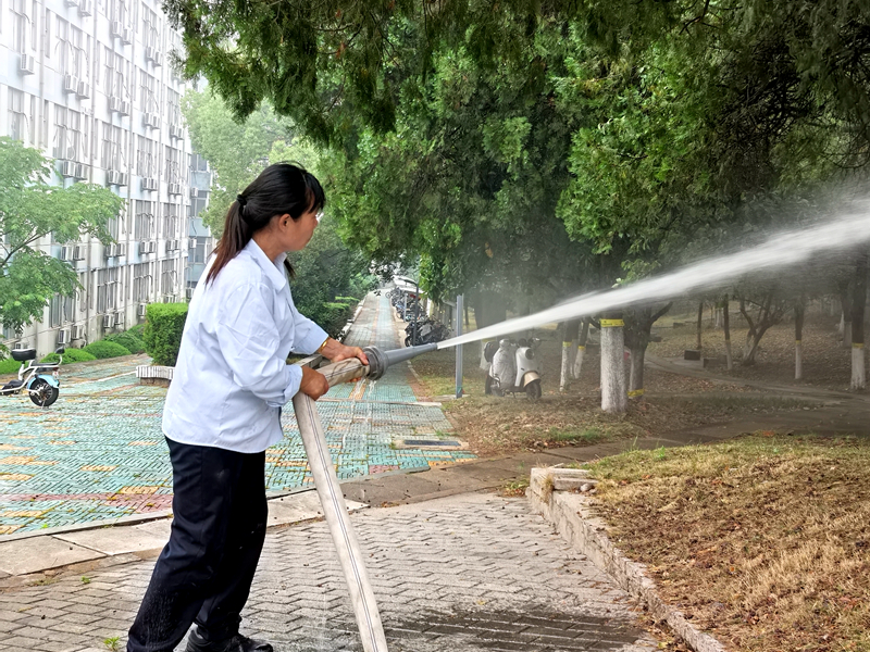 培训中,保卫处治安与消防科科长王廼静结合校园消防安全实际,详细讲解了火灾预防、初期扑救、疏散逃生等基本知识,并重点演示了灭火器、灭火毯、防烟面具、消防水带等消防器材的正确使用方法。参训人员认真聆听,积极互动,并在保卫处工作人员指导下依次进行实操演练,确保熟练掌握灭火技能。
