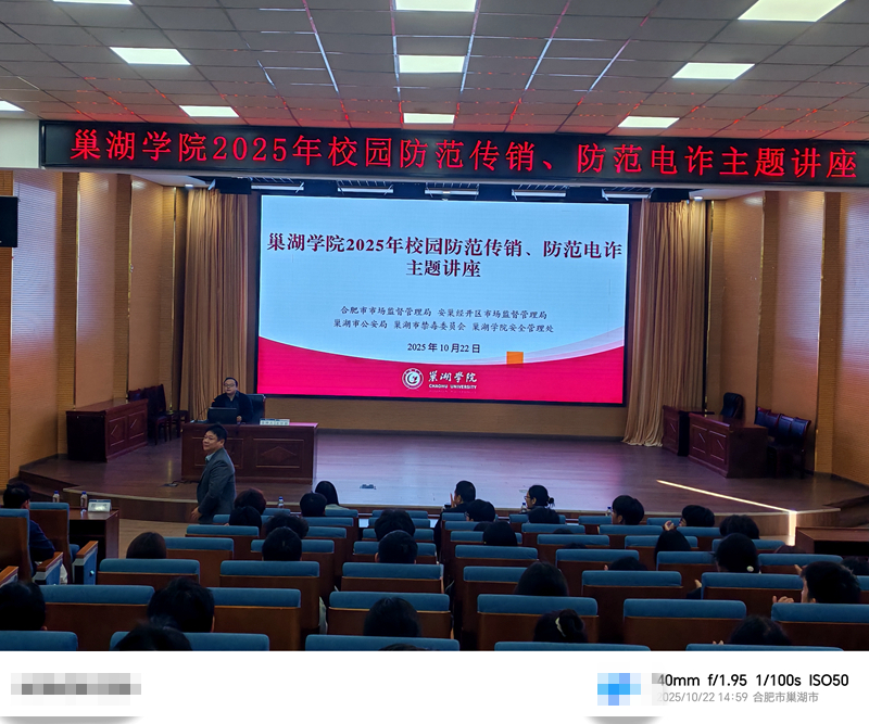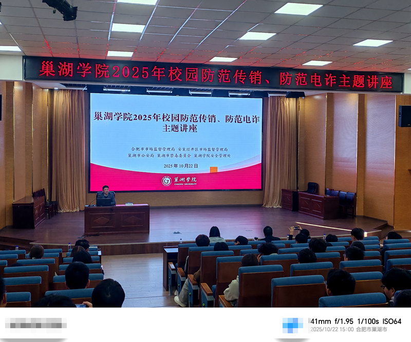 为切实增强大学生防范传销、电信诈骗和毒品侵害的意识和能力,营造安全、健康、和谐的校园环境,2025年10月22日下午,beat365中国官方网站安全管理处分别邀请合肥市市场监督管理局、安巢经开区市场监督管理局、巢湖市公安局、巢湖市禁毒委员会在求实楼报告厅联合举办“校园防范传销、防范电诈与禁毒主题讲座”。本次活动由安管处副处长朱寒冰主持。