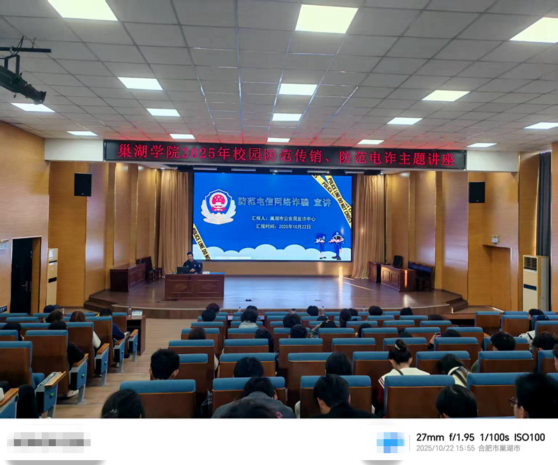巢湖市公安局刑侦大队副队长程成以“预防电信诈骗 打击网络犯罪”为主题,通过发生在大学生群体身边的一系列真实案例,剖析电信网络诈骗类型、作案手法及防范要点,提醒同学们在日常生活中做到不轻信、不转账、不泄露个人信息,切实守护好自己的“钱袋子”。