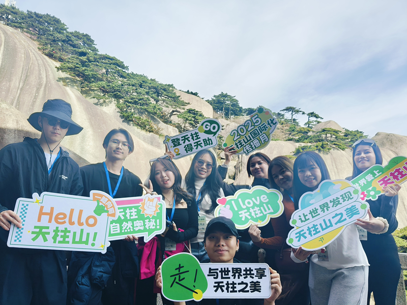 次日,留学生们开启天柱山风景区登山之旅。作为国家5A 级旅游景区、国家森林康养基地和“中国天然氧吧”,天柱山以“一峰擎日月”的壮美风光闻名遐迩,主峰海拔 1489.8米,景区内千峰竞奇、万壑藏幽,分布着名崖、奇石、异洞、涧瀑、云海等丰富自然景观。留学生们沿途欣赏千峰竞奇、云海缭绕的风光,了解“汉武帝封南岳”“三祖禅寺禅宗文化”等历史,并参与“登天柱,得天助”祈福活动。活动结束后,留学生们表示,将用他们的语言和视角,分享研学成果,努力成为中外文化交流的使者,让更多海外朋友了解这座兼具自然之美与文化之韵的名山。