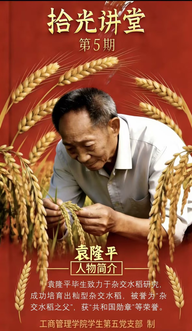 为汲取榜样精神养分,筑牢党员信仰根基,工商管理学院学生第五党支部于12月16日下午在博学楼504开展“拾光讲堂”第五期特色沙龙活动。本次活动以“一粒种子的初心,一生耕耘的信仰”为主题,聚焦“杂交水稻之父”袁隆平同志的先进事迹,通过海报解读、事迹分享、交流感悟等形式,让支部党员在重温榜样故事中感悟初心、汲取奋进力量。