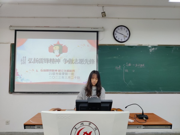 为进一步弘扬雷锋精神,传递青春正能量,让学雷锋活动融入日常,化为经常。21级市场营销一班于3月20日下午在博学楼206教室开展“弘扬雷锋精神 争做志愿先锋”主题团日活动,本次活动由辅导员许沙指导,团支书陈楼主持,21级市场营销一班全体同学参加。