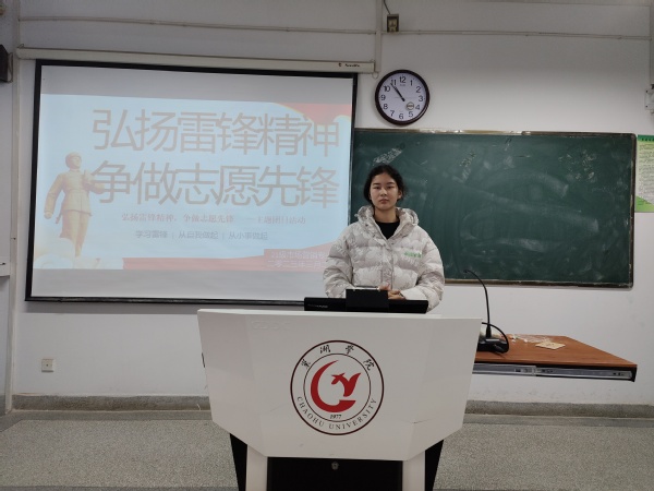 为大力弘扬雷锋精神,了解雷锋事迹雷锋个人成长经历,深入团员青年的内心,21级市场营销专业三班于3月22日中午在博学楼510教室开展“弘扬雷锋精神,争做志愿先锋”主题团日活动。此次活动由辅导员许沙指导,团支书王婷婷主持,21级市场营销专业三班全体成员参加。