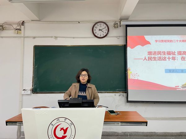 首先,金晶表示此次宣讲的主题为“增进民生福祉,提高人民生活质量”,并说到此次宣讲主要从四个方面展开——前言:党的二十大报告;变化:民生福祉的增进,提高;不变:为人民谋幸福,谋福祉;实践:坚持人民至上的思想。接着,金晶简单介绍了党的二十大主体内容“一个主题、十六个方面成就、六个坚持、一个新使命和十二个方面新部署”,有利于同学们进一步加深对党的二十大报告的理解。随后,金晶着重讲述了民生福祉的增进、提高,同时,把党的政策解读与同学们息息相关的生活变化结合在一起,用“话家常”和充满“烟火气”的小故事的方式让大家更好的理解政策。其次,金晶讲到为人民谋幸福,谋福祉的三个不变分别是守的底线不变,严的管理不变和高的追求不变,并举出相关例子让同学们更好的理解。最后,金晶讲述了坚持人民至上的思想,在这个实践过程中人民是党执政的最大底气,也是党执政最深厚的根基。