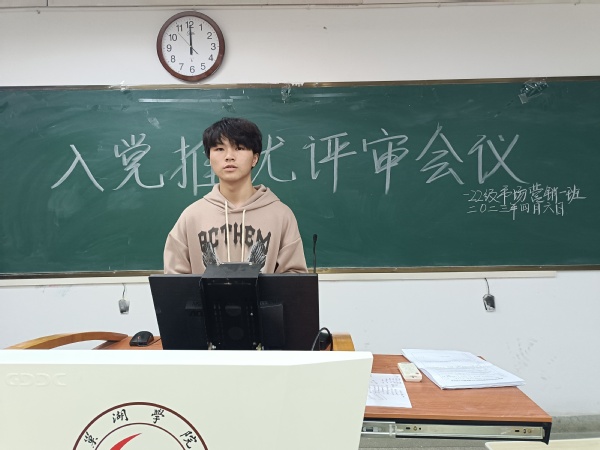 为加深对党的认识,加强党性修养,用党的指导思想武装头脑,坚决贯彻执行党的教育方针政策,22级市场营销一班于4月6日中午在博学楼109教室召开入党积极分子推优大会。此次会议由班长张超尘主持,辅导员许沙指导,22级市场营销一班评审小组参加。