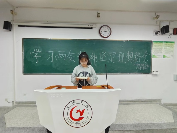 首先,胡书怡对本次活动流程及内容进行了简要介绍。她说道,“两会”是指中华人民共和国全国人民代表大会和中国人民政治协商会议的统称。接着,胡书怡带领同学们观看了中国从2013—2022年“两会”发展历史的视频,让同学们更加深入了解学习“两会”精神并动员同学们学习政治理论知识。随后,她对“两会”的报告进行解读,组织同学们回答“两会”知识,并且谈谈自身的感悟。最后,胡书怡总结道青年强,则国家强。作为当代大学生,要热爱祖国,自觉护卫祖国荣誉,坚定理想信念,勇担时代重任,积极传播正能量,做社会主义的接班人。