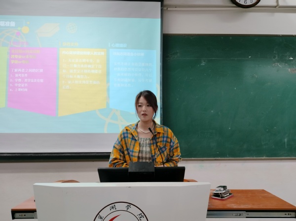 首先,陈齐齐进行简单的自我介绍,她在今年成功跨专业考取安徽师范大学图书情报专硕,并询问在座各位同学的考研意愿。接着,陈齐齐为同学们介绍自己的考研经验,结合自己的考研经历详细的给同学们讲解了读研的必要和在备考期间应注意的问题,包括考研各科的复习方法、考研信心的树立、考研计划、备考心态的调整、生活饮食习惯、作息时间安排,以及有关选择专业方向和复试等方面的经验。随后,王宇上台进行自我介绍并向各位同学分享她成功跨专业考取南通大学的马克思主义理论专业。对于如何考研,王宇分别从学习计划、学校选择、心态问题等几方面分析。学习计划方面,考研学习要分为三轮,每天都要安排时间计划着学习,同时强调注意休息,身体是革命的本钱;在学校的选择上,要适当选择优秀的学校;最后,王宇着重强调心态问题,她表示有一个良好的心态很重要,在考研的最后几星期同学们心情都会有一个低落期,一定要坚持到最后,调整好自己的心态。