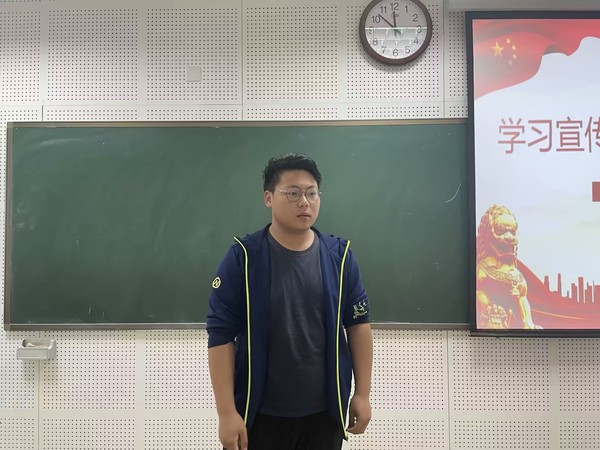 首先,蒋晟玮表示,党的二十大是在全党全国各族人民迈上全面建设社会主义现代化国家新征程、向第二个百年奋斗目标进军的关键时刻召开的一次十分重要的大会。大会通过的报告高举中国特色社会主义伟大旗帜,全面贯彻习近平新时代中国特色社会主义思想,科学分析了国际国内形势,回顾总结了过去五年的工作和新时代十年的伟大变革,阐述了开辟马克思主义中国化时代化新境界、中国式现代化的中国特色和本质要求等重大问题。希望同学们能够认真学习党的二十大精神,充分理解其宝贵内涵,做堪当时代大任的时代新人。随后,蒋晟玮表示,中华民族在五千多年历史上创造了灿烂的文明,为人类作出了不可磨灭的贡献。但近代以来,由于西方列强入侵和封建统治腐败,中国逐步成为半殖民地半封建社会,陷入内忧外患的黑暗境地,国家蒙辱、人民蒙难、文明蒙尘。中国共产党一经诞生,就把为中国人民谋幸福、为中华民族谋复兴作为自己的初心使命。一百年来,中国共产党领导人民经过顽强奋斗,争取民族独立、人民解放和实现国家富强、人民幸福的伟大历史任务,一个又一个变为现实。最后,蒋晟玮公布展示了同学们之前制作的优秀手抄报及粉笔字作品,并邀请部分同学就革命党恩故事进行分享。