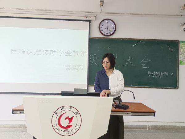 为明确和说明奖助学金的评定标准以及相关政策,21级财务管理专业一班于9月14日下午在博学楼510教室开展本次困难认定奖助学金政策宣讲会。本次会议由辅导员任洁老师主持,21级财务管理专业一班全体同学共同参与。