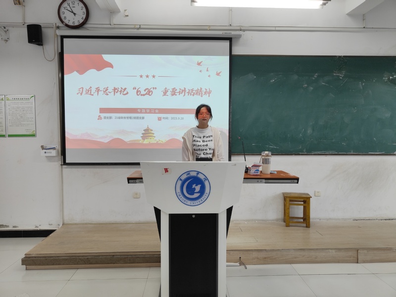 为更好把青年一代团结凝聚在党的周围,为推进强国建设、民族复兴伟业接续奋斗,21级财务管理二班于9月25日上午在慎思楼北201召开学习习近平总书记“6.26”重要讲话话精种专题学习会。本次活动由辅导员任洁老师指导,团支部书记李旭主持,21级财务管理二班全体团支部成员参加。