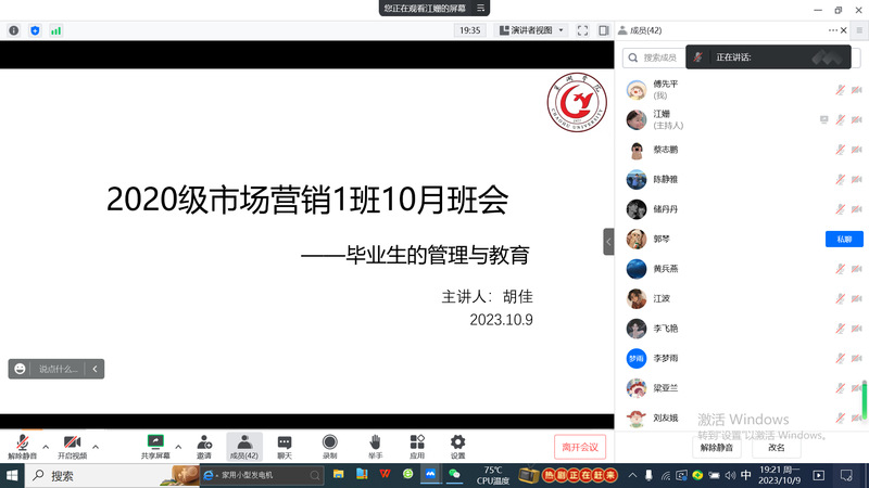 为帮助同学们明确就业方向,更好的实现自身价值与发展,20级市场营销专业一班于10月9日晚在线上召开了十月班会—毕业生的管理与教育。此次会议由辅导员李梦雨主持,学校党委学生工作部办公室秘书胡佳老师出席,20级市场营销专业一班全体同学参加。