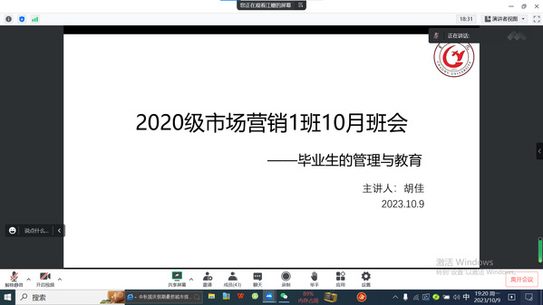 为帮助同学们明确就业方向,更好的实现自身价值与发展,20级市场营销专业一班于10月9日晚在线上召开了十月班会—毕业生的管理与教育。此次会议由辅导员李梦雨主持,学校党委学生工作部办公室秘书胡佳老师出席,20级市场营销专业一班全体同学参加。