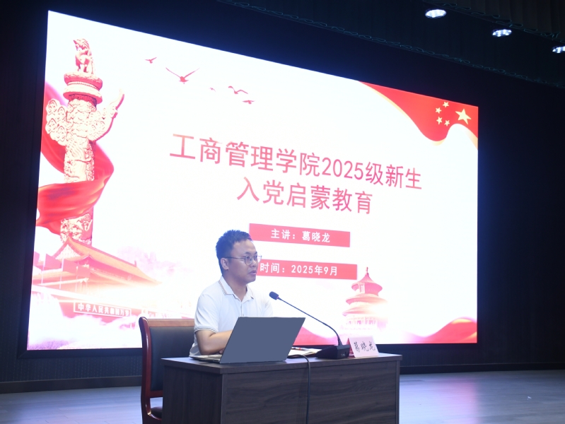 9月10日下午,工商管理学院在大学生活动四楼礼堂举行2025级新生入学教育活动。活动邀请学院组织员、各专项工作负责人为新生开展入党启蒙教育、资助政策宣讲、“第二课堂成绩单”制度解读等教育活动,帮助新生明晰学业目标、筑牢成长根基,更快更好地适应大学阶段的学习与生活。活动由学院党委副书记何冬冬主持。