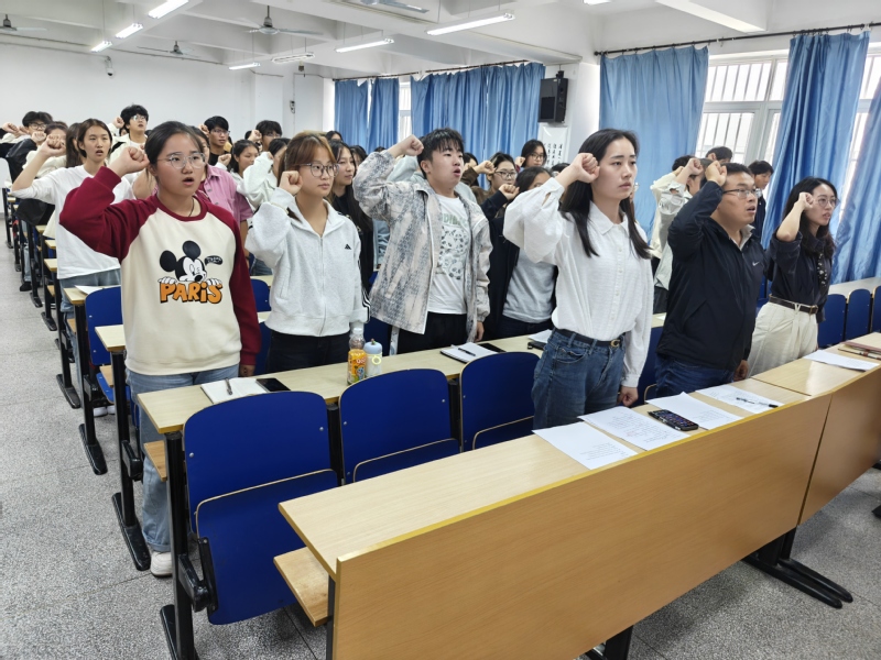 随后,周玉洁带领全体志愿者宣誓,铿锵有力的誓言彰显了志愿者们的坚定决心。这不仅让成员领悟到了志愿服务精神的真谛,同时也坚定全体成员为同学、为学院以及为社会服务奉献的决心。