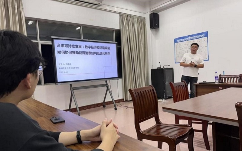 2025年10月15日,beat365中国官方网站经济与法学学院开展题为“追求可持续发展:数字经济和环境规制如何协同推动中国能源消费结构转型”的讲座。本次讲座系学校汤山学术论坛的系列讲座之一,由经济学博士张海军主讲。