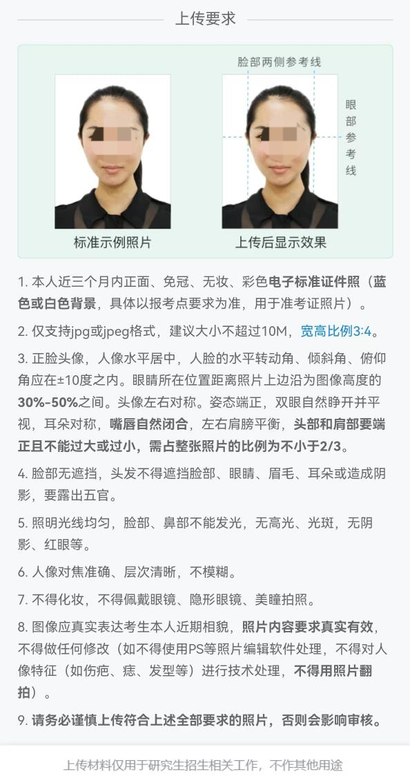 1.本人近期正面免冠彩色电子证件照片(白色或蓝色背景,用于准考证照片)、本人有效身份证人像面及国徽面、本人手持身份证电子照片。照片要求如下: