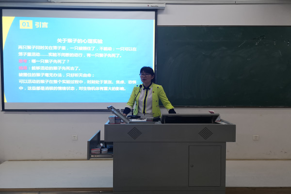 朱平首先向同学们发出倡议,希望大家能够关爱自己、关心他人,自觉养成“自尊自信、理性平和、积极向上”的健康心态,努力构建“和谐心灵、和谐校园、和谐社会”。她通过列举关于“猴子的心理实验”的例子表明紧张、焦虑、恐惧等消极的情绪状态对生物机体有重大的影响。希望同学们正确认识自己的心理发展特点,加强自身心理素质培养。