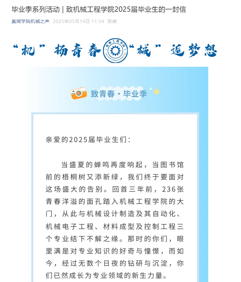 拍摄一部祝福视频。学院依托“机械之声”易班中心,制作了《械逅时光 青春再见》祝福视频。视频回顾了2025届毕业生大学四年的美好时光,并送上学院领导老师和学弟学妹们的真诚祝福。