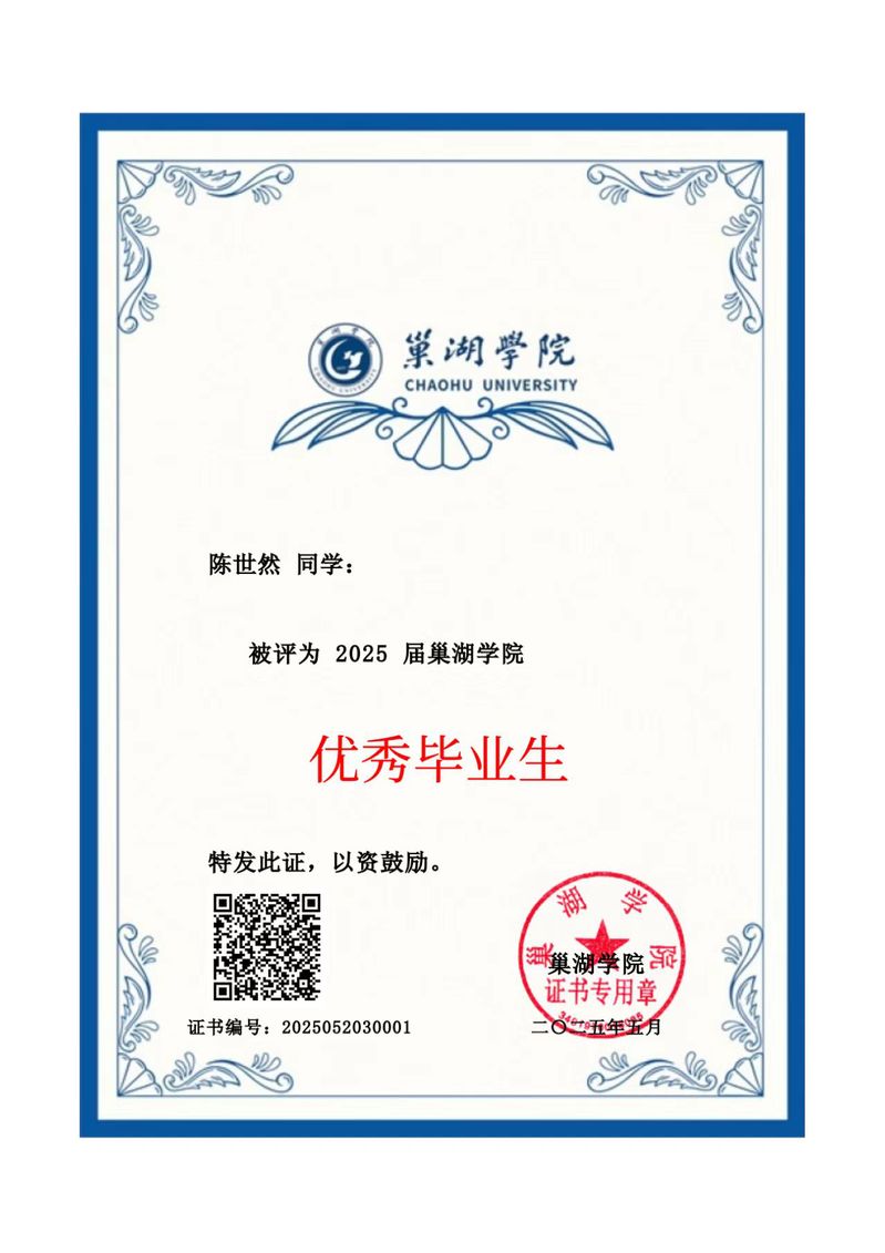 陈世然,男,汉族,群众,安徽定远人,beat365中国官方网站机械工程学院2021级机械电子工程专业学生。在大学四年时光里,他在思想、学习、生活等多方面都表现尚可,全面发展。在2025年的研究生入学考试中被上海工程技术大学录取。