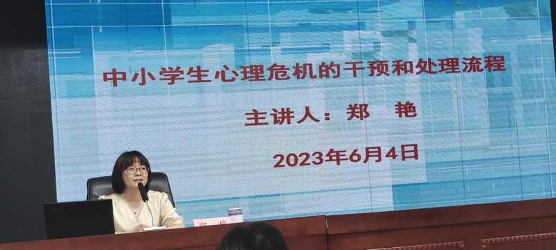 为了加强与巢湖市教体局和中小学的联系,应巢湖市教体局之邀,6月5日下午,教师教育学院副院长、心理健康中心副主任郑艳前往人民路小学西校区报告厅,做了一场主题为“中小学生心理危机的干预和处理流程”的培训讲座。巢湖市教体局党委委员、市政府教育督导室主任陈大文主持培训会,巢湖市中小学校长及幼儿园园长近145人全程参加。
