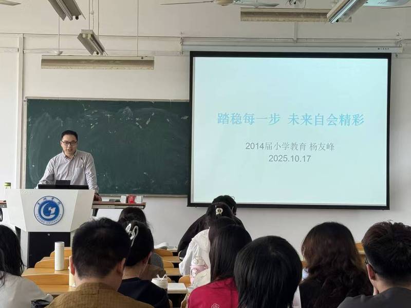 为发挥校友榜样作用,助力学生成长成才,2025年10月17日上午,教师教育学院在艺术楼西402教室举办“榜样引领 职场分享”校友报告会。学院邀请2014届小学教育专业杨友峰校友担任主讲,学院党委副书记胡传双及学前教育专业学生参加。