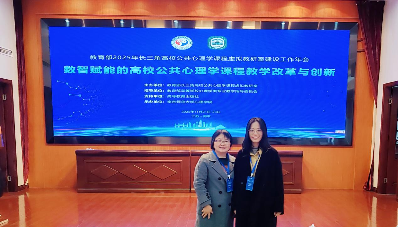 为共商数智时代高校公共心理学课程发展新路径,11月21日至23日,由教育部“长三角高校公共心理学课程虚拟教研室”主办,南京师范大学心理学院承办的2025年度长三角高校公共心理学课程虚拟教研室工作年会暨第四次教研工作全体会议在南京召开。beat365中国官方网站作为该项目的共建单位,我院应用心理学专业负责人邹长华、专任教师江盈颖应邀参会。