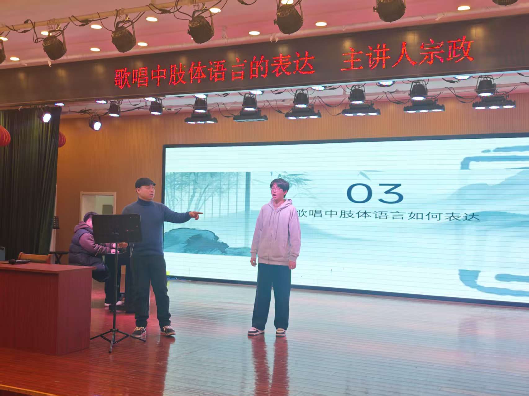 在讲解肢体语言的具体运用时,宗政强调动作需贴合歌曲情感,与作品风格保持一致,并始终以不干扰气息与共鸣为原则。讲座引导学生在声乐训练与舞台实践中,逐步建立对肢体语言的自觉意识,使其成为音乐表达的有机组成部分。