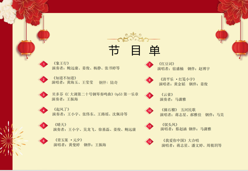 音乐会在器乐合奏《象王行》中拉开序幕,同学们以饱满的热情、和谐的和声抒发家国情怀,瞬间点燃现场氛围。随后,声乐独唱、钢琴独奏、器乐合奏等12个节目轮番登场、形式丰富多样,贝多芬《C大调第二十号钢琴奏鸣曲》OP53第一乐章的激情澎湃、《红豆词》的哀婉缠绵、《红旗颂》选段的韵致悠扬给现场观众带来耳目一新的体验,同学们以扎实的专业功底和灵动的艺术表现力,将经典作品演绎得淋漓尽致,展现出对音乐艺术的深刻理解与执着追求。演出结束后,所有演出人员和到场师生合影留念。