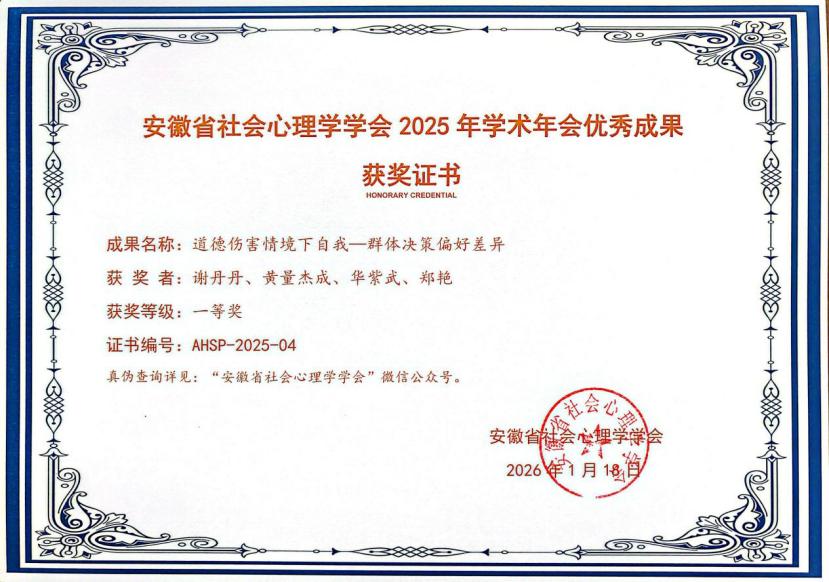 本次学术年会共收到中国科学技术大学、武汉大学、南开大学、北京航空航天大学、兰州大学、中国政法大学、安徽大学、合肥工业大学、首都师范大学,以及省内各高校的学术论文148篇,后期经学会学术委员会严格评审,共评出一等奖7名,二等奖14名,三等奖15名,优秀奖10名予以表彰。谢丹丹的论文《道德伤害情境下自我—群体决策偏好差异》荣获年会优秀成果一等奖,并被安徽省社会心理学会收录。