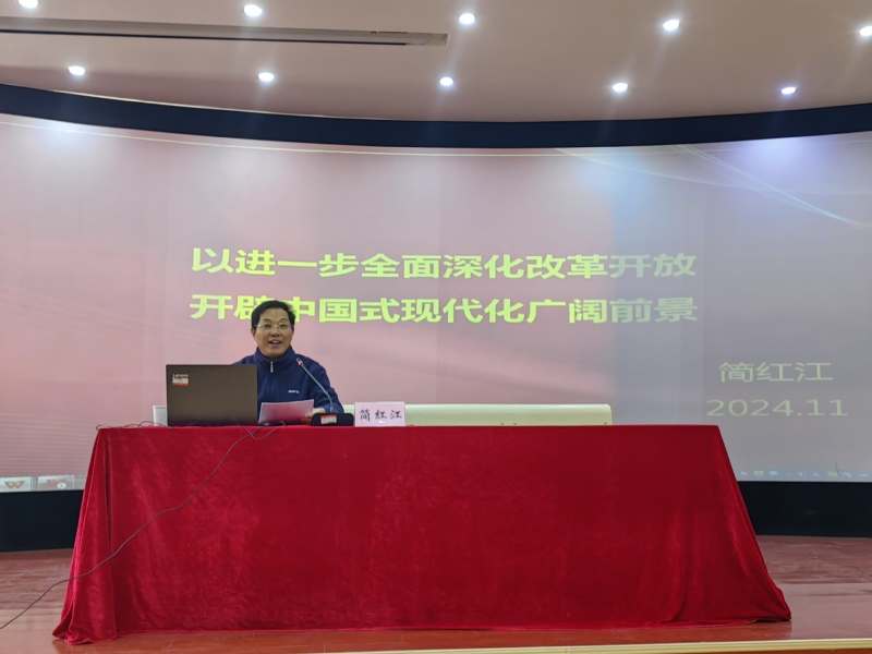 为深入学习贯彻党的二十届三中全会精神,按照学校统一部署,11月27日,在博学楼3D导游实训室内,学校教师宣讲团成员、马克思主义学院教授简红江为旅游学院全体教职工、第28期入党积极分子带来了一场党的二十届三中全会精神宣讲活动。