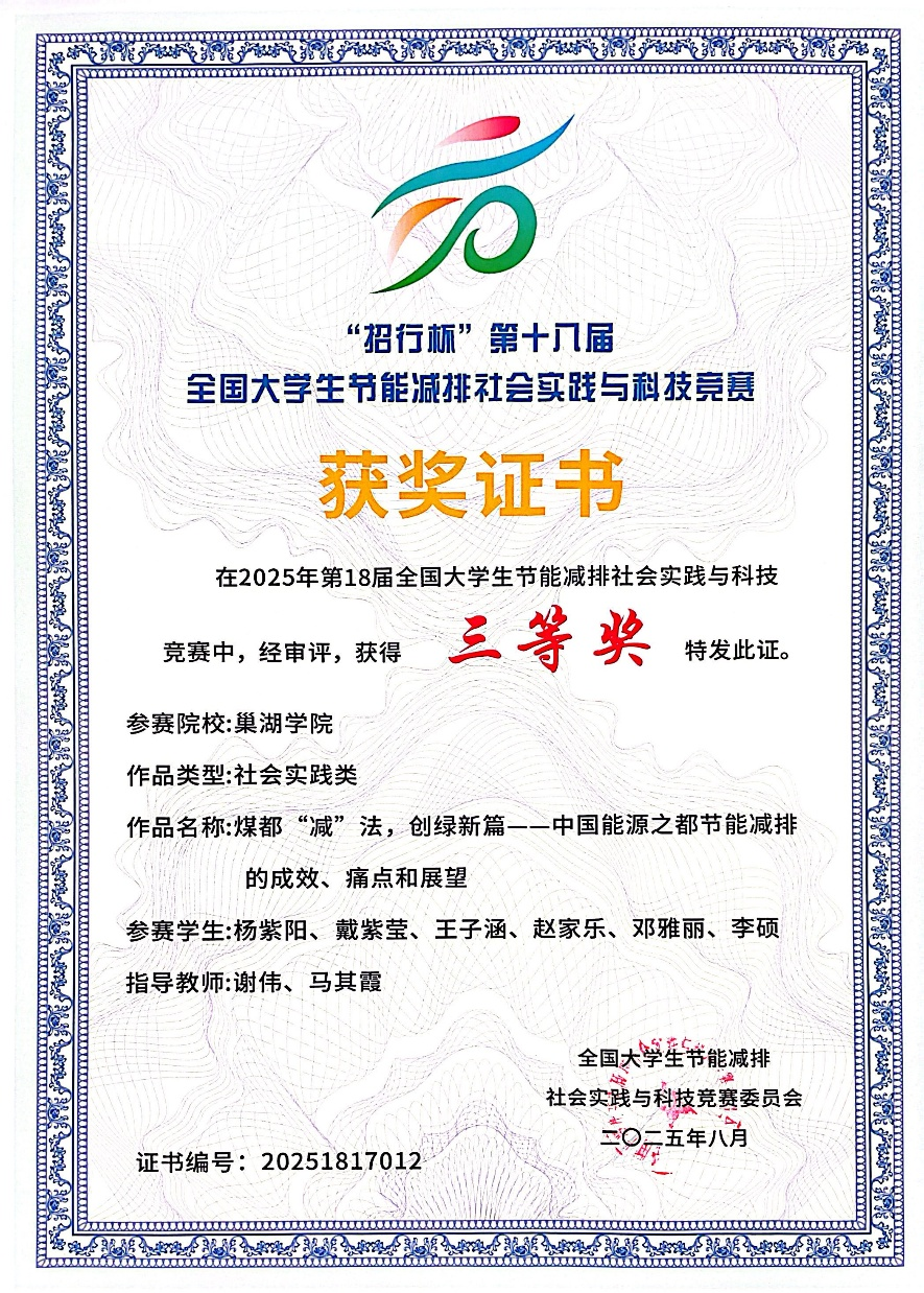 近期,由教育部高等学校能源动力类专业教学指导委员会指导,全国大学生节能减排社会实践与科技竞赛委员会主办的“招行杯”第十八届全国大学生节能减排社会实践与科技竞赛(A类赛事)落下帷幕。beat365中国官方网站旅游管理学院团队(参赛学生:杨紫阳、戴紫莹、王子涵、赵家乐、邓雅丽、李硕,指导教师:谢伟、马其霞)以作品《煤都“减”法,创绿新篇——中国能源之都节能减排的成效、痛点和展望》参赛,经过校赛、函评、会评脱颖而出,最终荣获国家级三等奖。