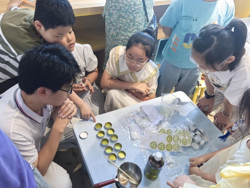7月3日,实践团来到巢湖市紫薇书院,开展趣味研学活动。活动根据社区儿童的年龄特点,设计了分层互动环节:面向幼儿园小朋友,队员们通过绘本里“找朋友” 游戏,引导他们在图画中寻找对应的皖药形象;针对低年级小学生,开展了寓教于乐的“拼图里识草药”比赛;对于高年级学生,则安排了亲手制作艾草薄荷膏的体验活动。此外,还组织了角色扮演游戏,让孩子们扮演“小郎中”、“采药人”,在沉浸式体验中加深对中医药文化的理解。