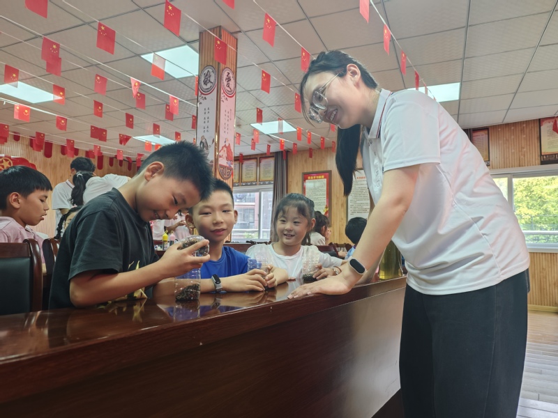在“微观世界”生态瓶制作中,队员们通过PPT演示讲解生态系统的物质循环原理。孩子们在志愿者指导下,利用多肉植物、营养土、装饰石子等材料,亲手构建属于自己的微型生态系统。志愿者们还以“一问一答”的互动方式,引导孩子们思考每一层材料在生态循环中的作用。