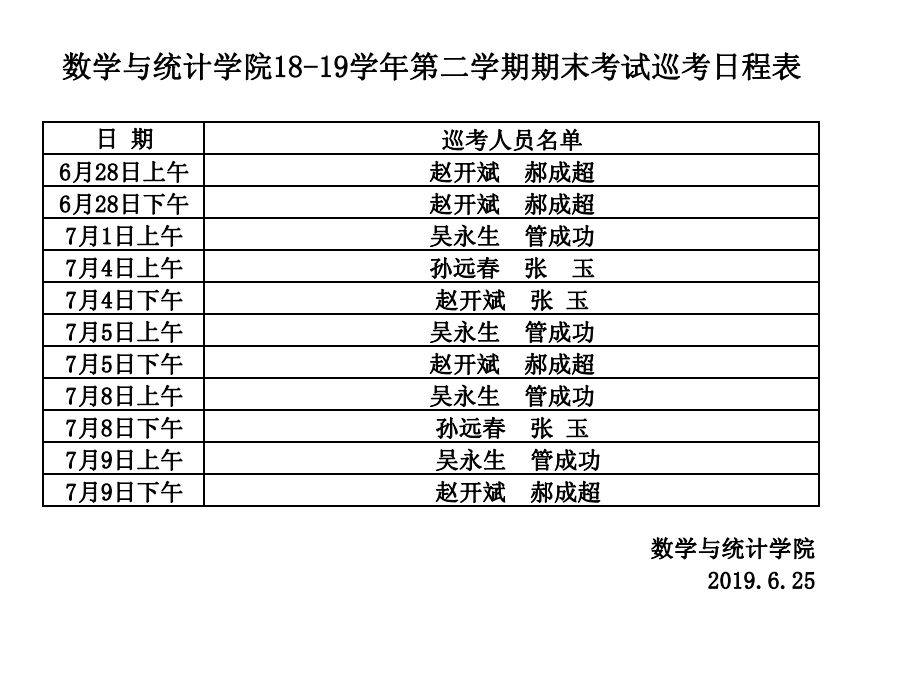 数学与统计学院18-19学年第二学期期末考试巡考日程表