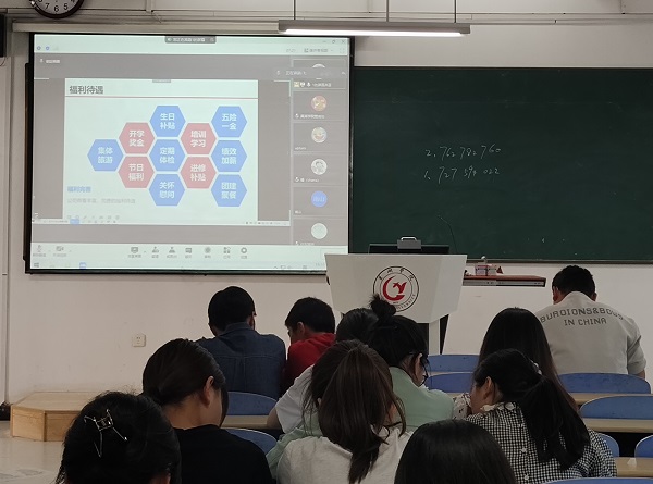 会议伊始,管成功向在场同学介绍了芜湖徽文中学的情况与招聘需求。随后,刘玲从校园文化、办学理念、福利待遇、学历培养、学校需求等各方面对芜湖徽文中学进行介绍。最后,刘玲表示感兴趣的同学可以在会后进行线上咨询,也会针对同学们提出的问题进行解答。