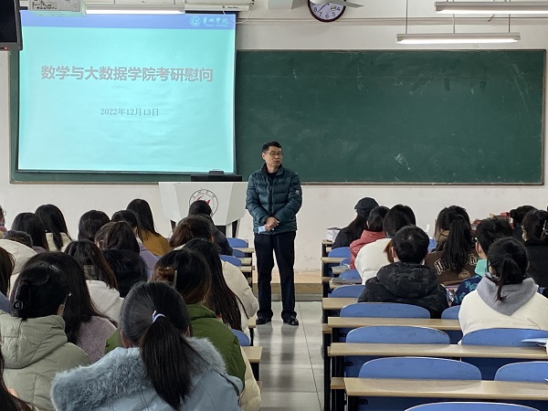 2023年全国硕士研究生招生考试即将到来,为帮助同学们缓解压力,坚定必胜信心,12月13日上午,数学与大数据学院于慎思楼中101召开2023届毕业生考研慰问活动,学院党委书记史国东、党委副书记郝江锋及全体考研学生参加会议,会议由毕业班辅导员管成功主持。