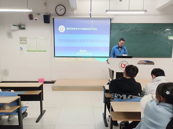 为进一步学习贯彻党的二十大精神,认真贯彻落实习近平总书记关于青年工作的重要思想,数学与大数据学院面向学院各团支部、学生组织开展了为期7天的第二期“青马工程”学生骨干培训,数学与大数据学院副院长陈佩树、团委副书记冀祥麟、辅导员管成功、马克思主义学院贾绍俊博士分别主讲。