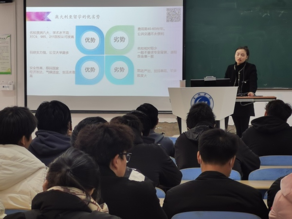 接着,合肥博士社出国留学顾问刘敬老师通过详实的数据和典型的案例为同学们讲解了本科生留学的相关资讯,并重点阐述了马来西亚、英国、美国等国家和地区的留学情况。同时,以应用统计学专业为例,多方面详细分析了出国留学的最新形势,在国家选择、相关院校招生规则以及专业发展等方面给同学们提供了宝贵的建议。