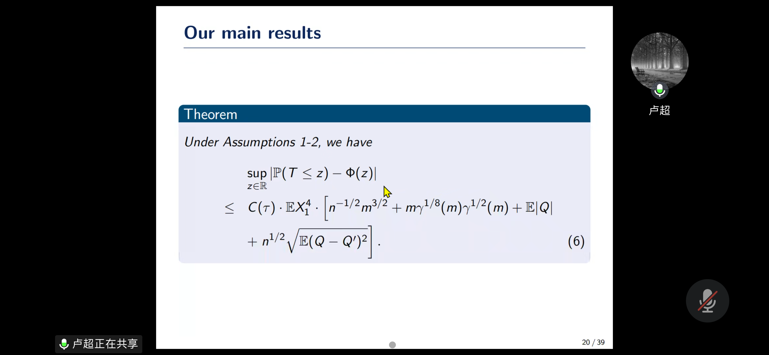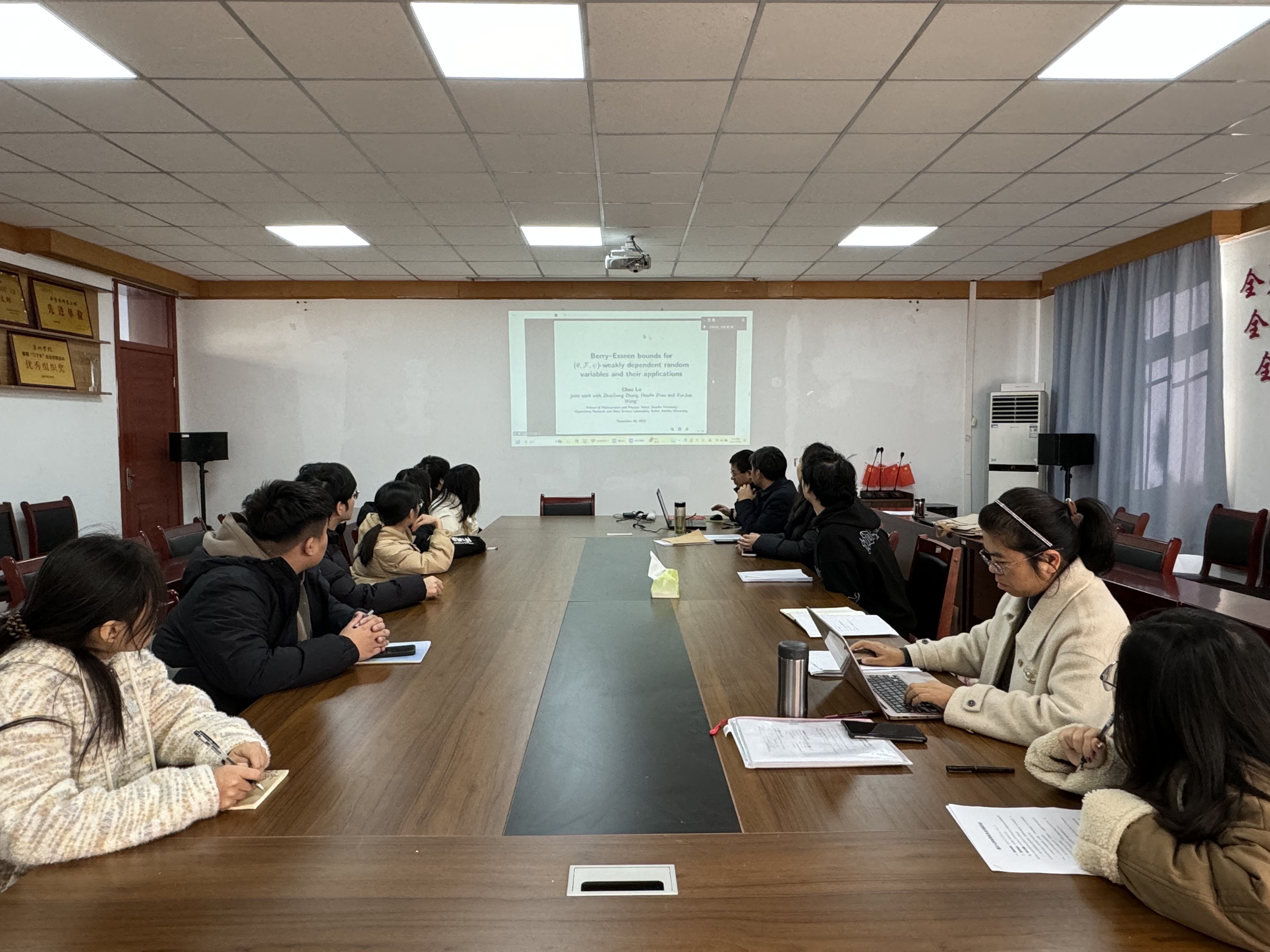 卢超则带来了题为《Berry-Esseen bounds for (θ, F, ψ)-weakly dependent random variables and their applications》的精彩报告。他针对一类新型弱相依随机变量建立了Berry-Esseen界,并探讨了其在统计推断与风险评估中的具体应用,为极限理论在非经典相依结构下的推广提供了有力支撑。