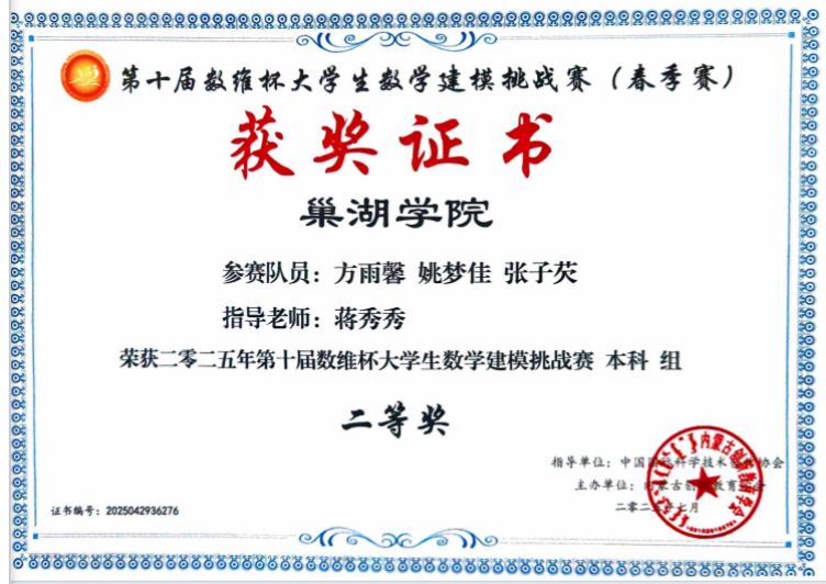 协会自成立以来,成员们在各类建模竞赛中屡创佳绩,充分展现出强劲的创新能力与专业素养。在2024年全国大学生数学建模竞赛中,我校共有33支队伍提交竞赛作品,17支队伍荣获奖项,获奖率达51%;2025年赛事再创突破,参赛队伍增至49支,30支队伍获奖,获奖率提升至 61%,获奖数量在省内同类院校中名列前茅。在备赛与竞赛过程中,参赛队员们认真钻研题目、严谨构建假设、科学建立模型,大家分工协作、相互配合,以扎实的专业能力和坚韧的拼搏精神攻克一道道难题。同学们在高压环境下沉着应对、迎难而上,充分展现了巢院学子良好的综合素养,也集中体现了学校在数学教学改革与创新人才培养方面的扎实成效,是“学赛结合、以赛促学”育人模式的生动体现。优异成绩的取得,不仅有效提升了学生的专业应用能力,更进一步激发了大家的创新思维与团队协作意识,为学校学科竞赛与人才培养工作持续赋能。