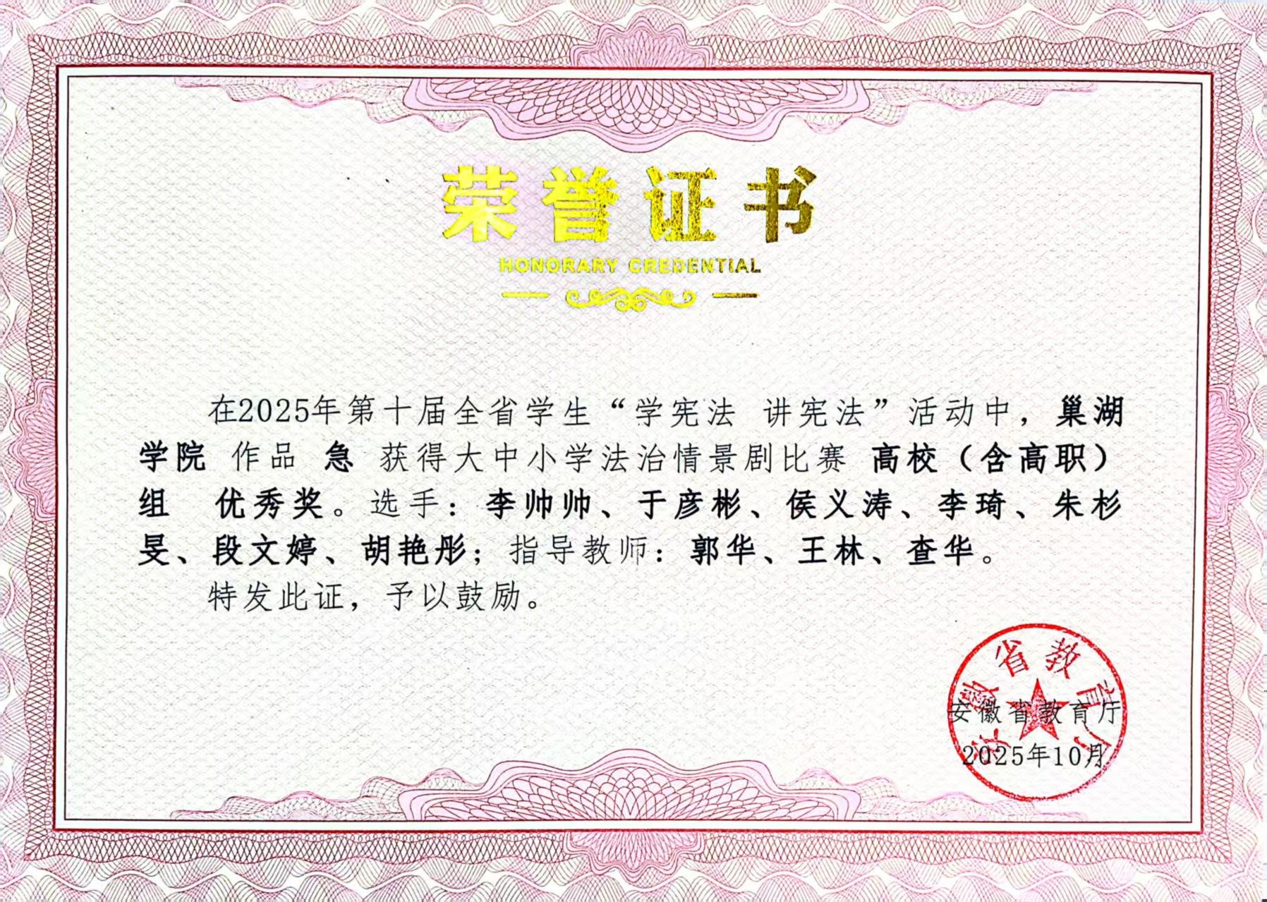 2025年第十届全省学生“学宪法 讲宪法”比赛优秀奖