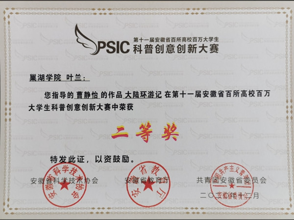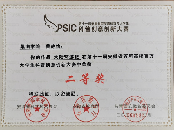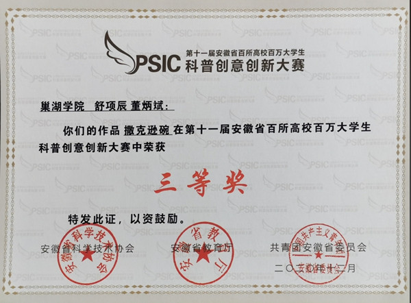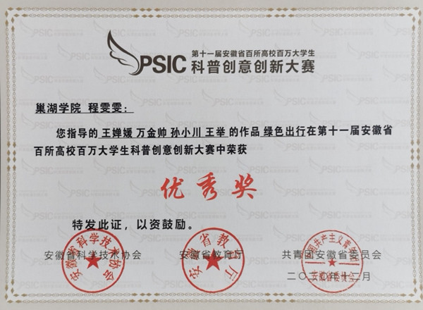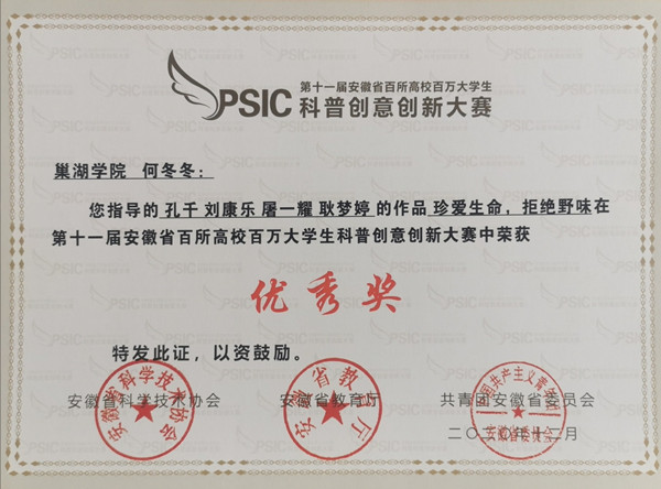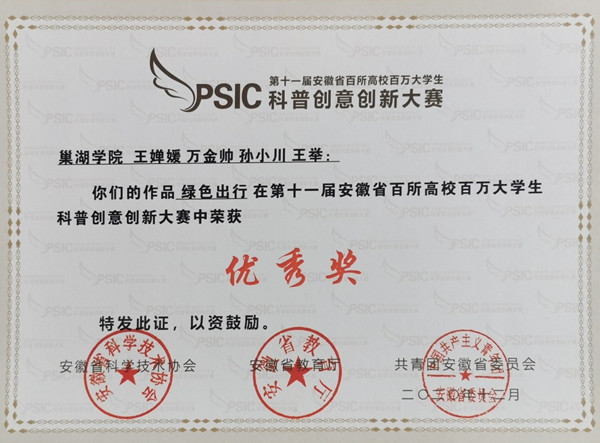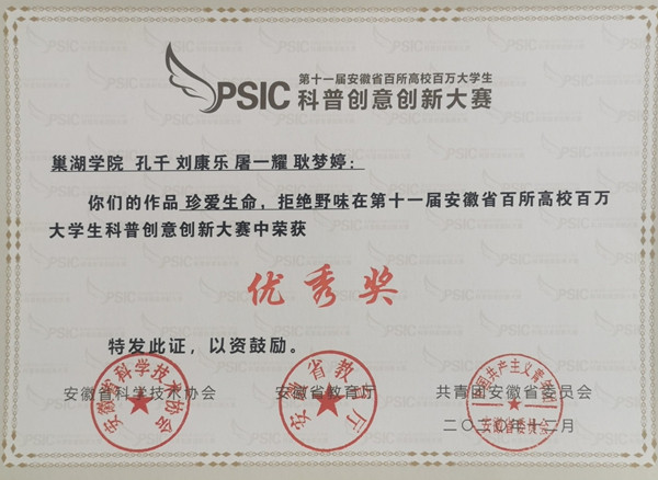 第十一届安徽省百所高校百万大学生科普创意创新大赛获奖证书