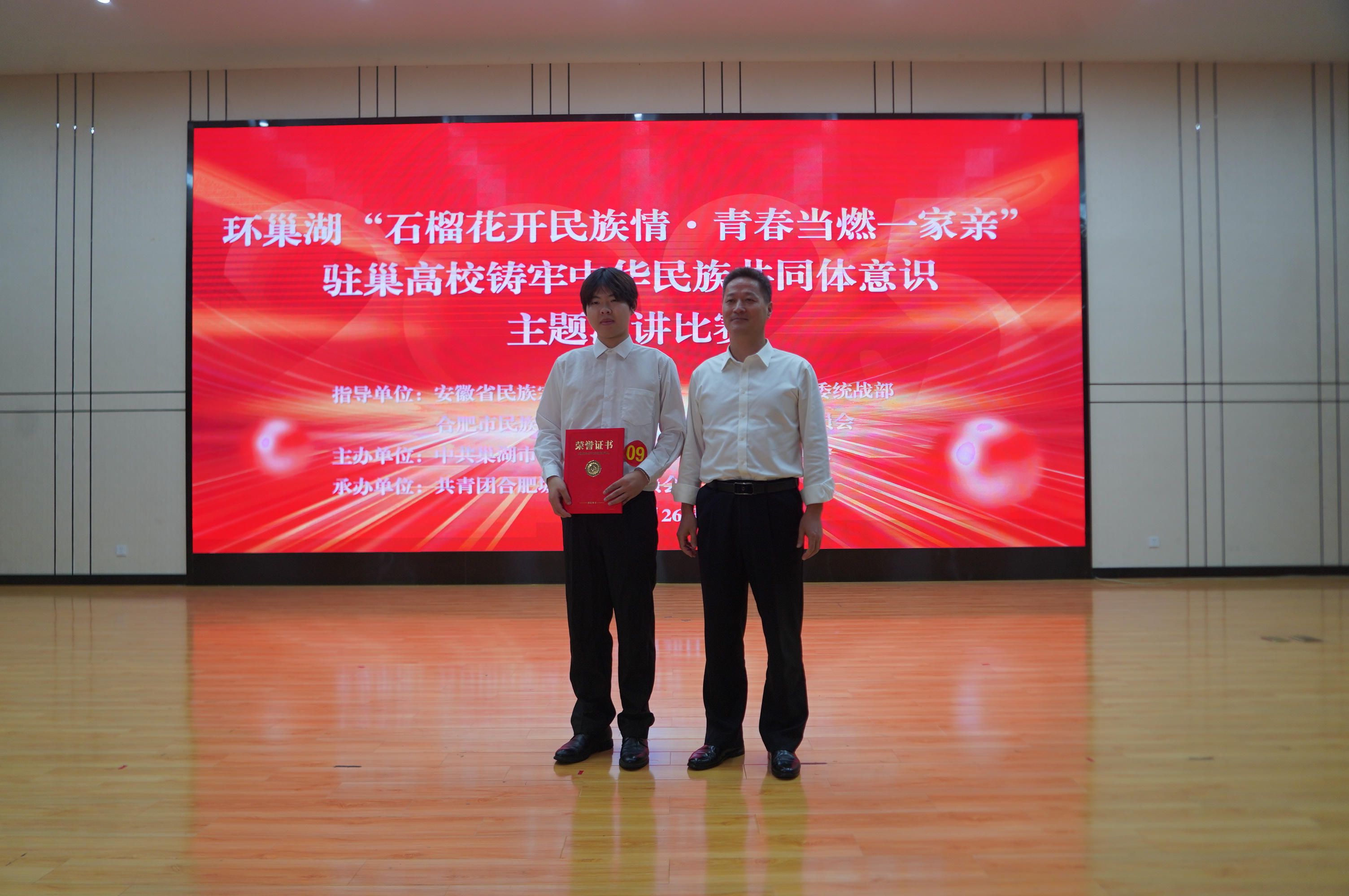 决赛现场,我校黄佳佳同学以《同谱华夏交响乐 共筑团结新篇章》为题,结合自己所学专业,把国家的发展比作一部恢弘的交响乐,56个民族是其中不可或缺的声部,每个人都是新时代“交响乐”的演奏者。他认为,铸牢中华民族共同体意识,不是遥远的口号,而是每个人演奏好每一个音符的责任——既要守护好自己民族的独特音色,也要学会与其他“声部”和谐共鸣。肖炳祥同学则以一部历史电影《红河谷》为切入点,结合巢湖以展演融多俗、景区传认同、社区创示范,绘就民族团结盛景的鲜活事例,阐述了民族团结不仅是中华民族千百年来的精神财富,更是国家繁荣昌盛的稳固基石,各民族要像石榴籽一样紧紧相依。经过激烈角逐,最终,我校黄佳佳、肖炳祥2位同学分别荣获特等奖(全场唯一)、二等奖的好成绩,充分展现了我校学子优良的综合素养和昂扬的精神风貌,更体现了新时代青年深厚的家国情怀,赢得了评委与观众的广泛共鸣和认可。
