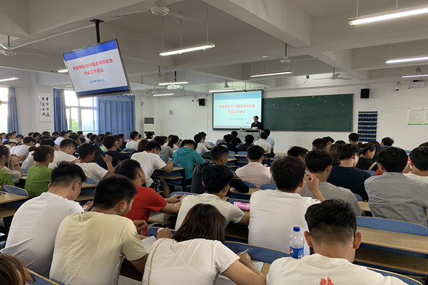 5月22日下午,体育学院2019届毕业生工作会议在慎思楼中201教室举行。体育学院党总支书记芮德武,教学秘书汪健,教研室主任周雪华、艾显斌,毕业班辅导员和204名毕业生参加会议。